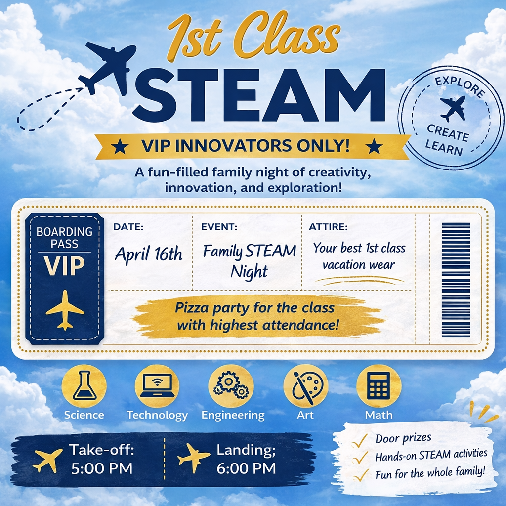 Get ready for takeoff as we invite all of our families to a fun-filled evening of creativity, innovation, and exploration at our Family STEAM Night!