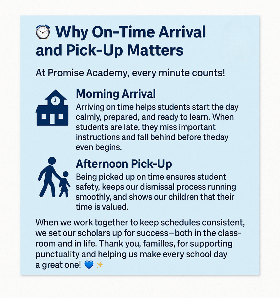 At Promise Academy, every minute counts! When we work together to keep schedules consistent, we set our scholars up for success—both in the classroom and in life. Thank you, families, for supporting punctuality and helping us make every school day a great one! 💙📚✨