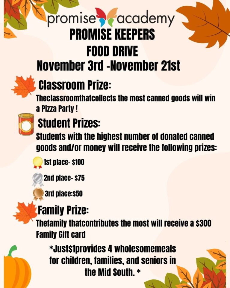 📢 Promise Keepers Food Drive Is On!Now through November 21, we’re collecting canned goods and monetary donations to help feed families right here in the Mid-South. Every dollar matters — just $1 provides 4 wholesome meals! 🎁 PRIZES!🏆 Top 3 Students — $100 • $75 • $50🍕 Top Classroom —...